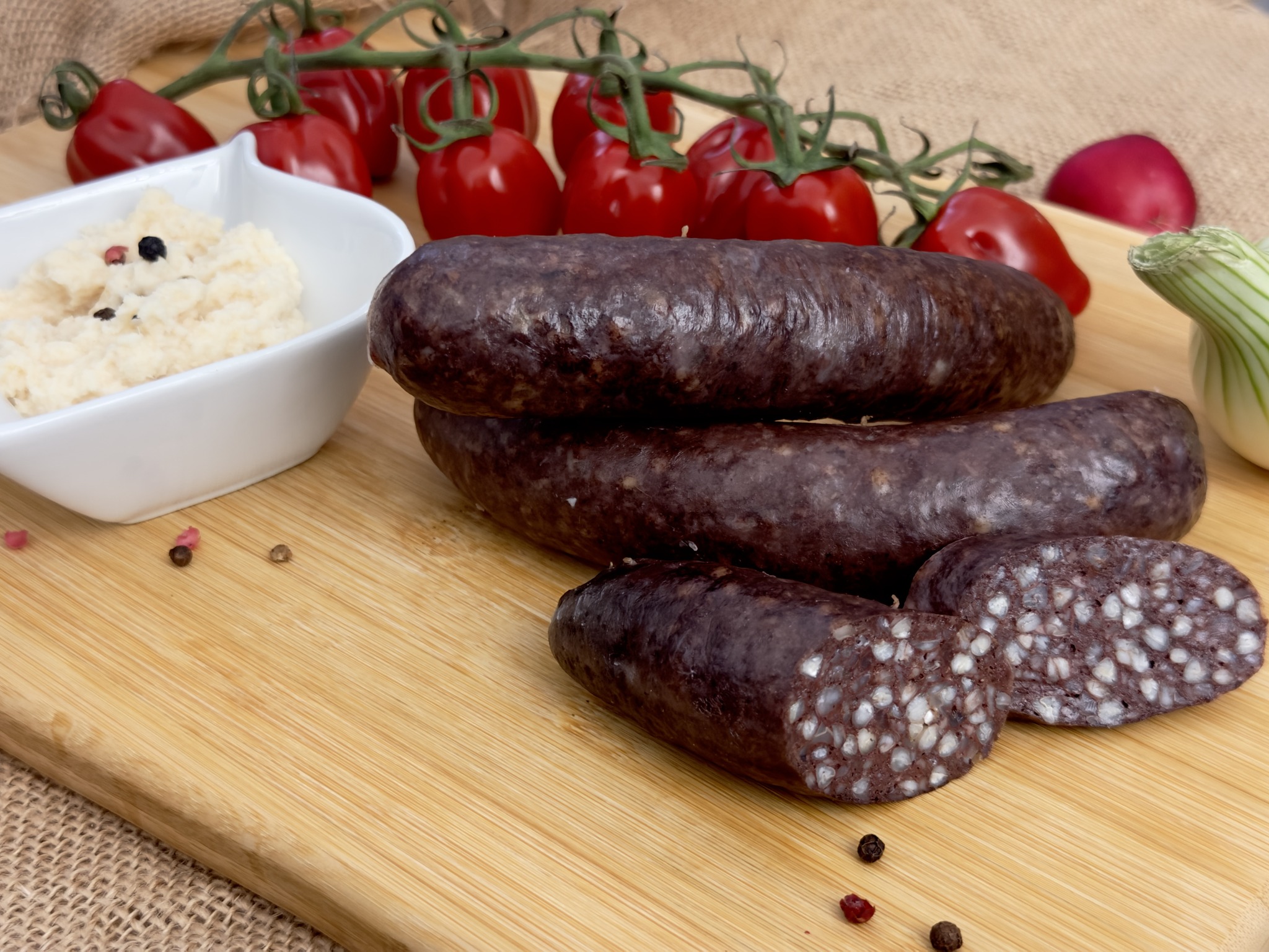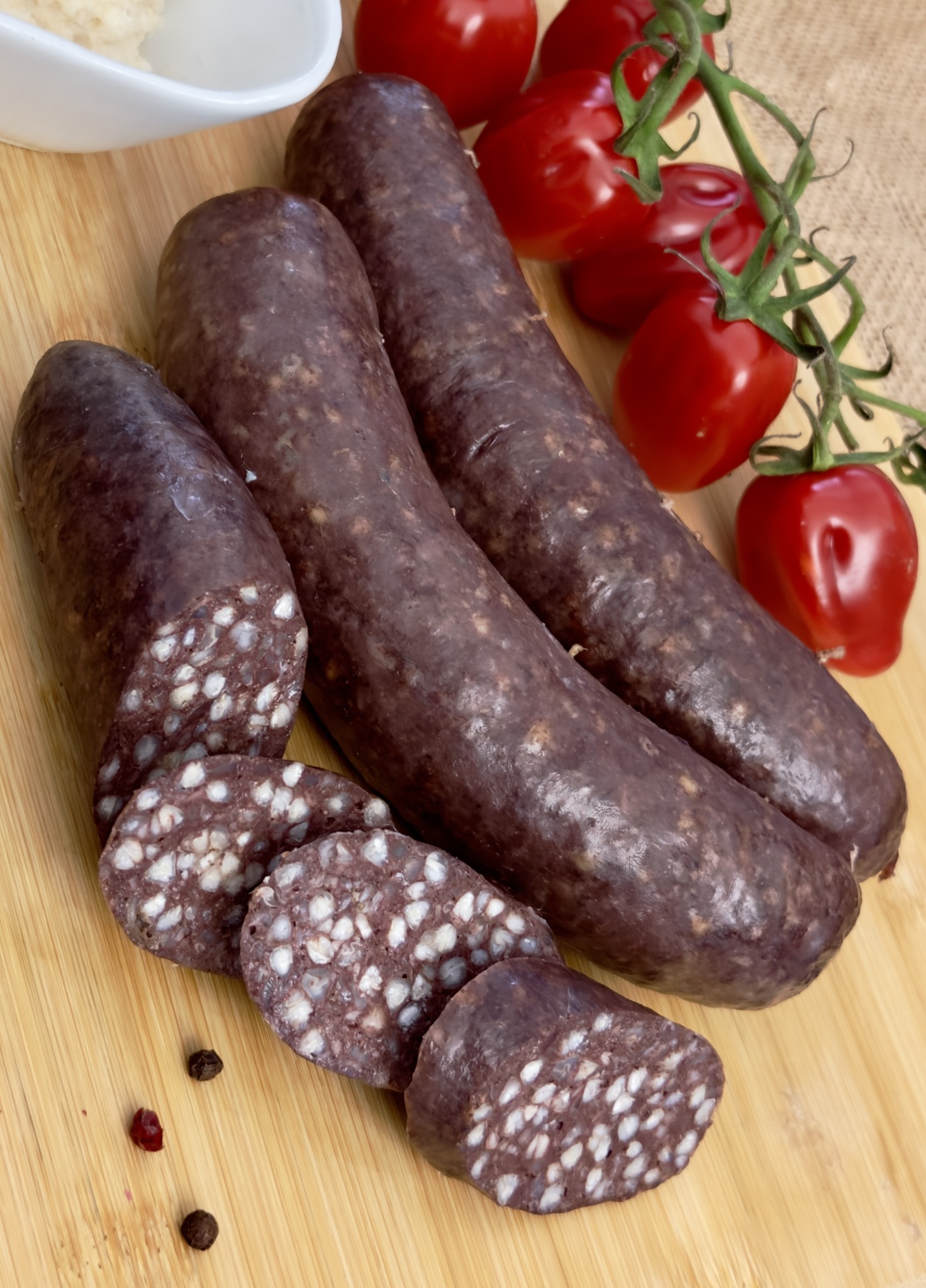 Kaszanka tradycyjna – Z dodatkiem świeżej krwi, kaszy gryczanej i majeranku. Idealna na patelnię z cebulką.