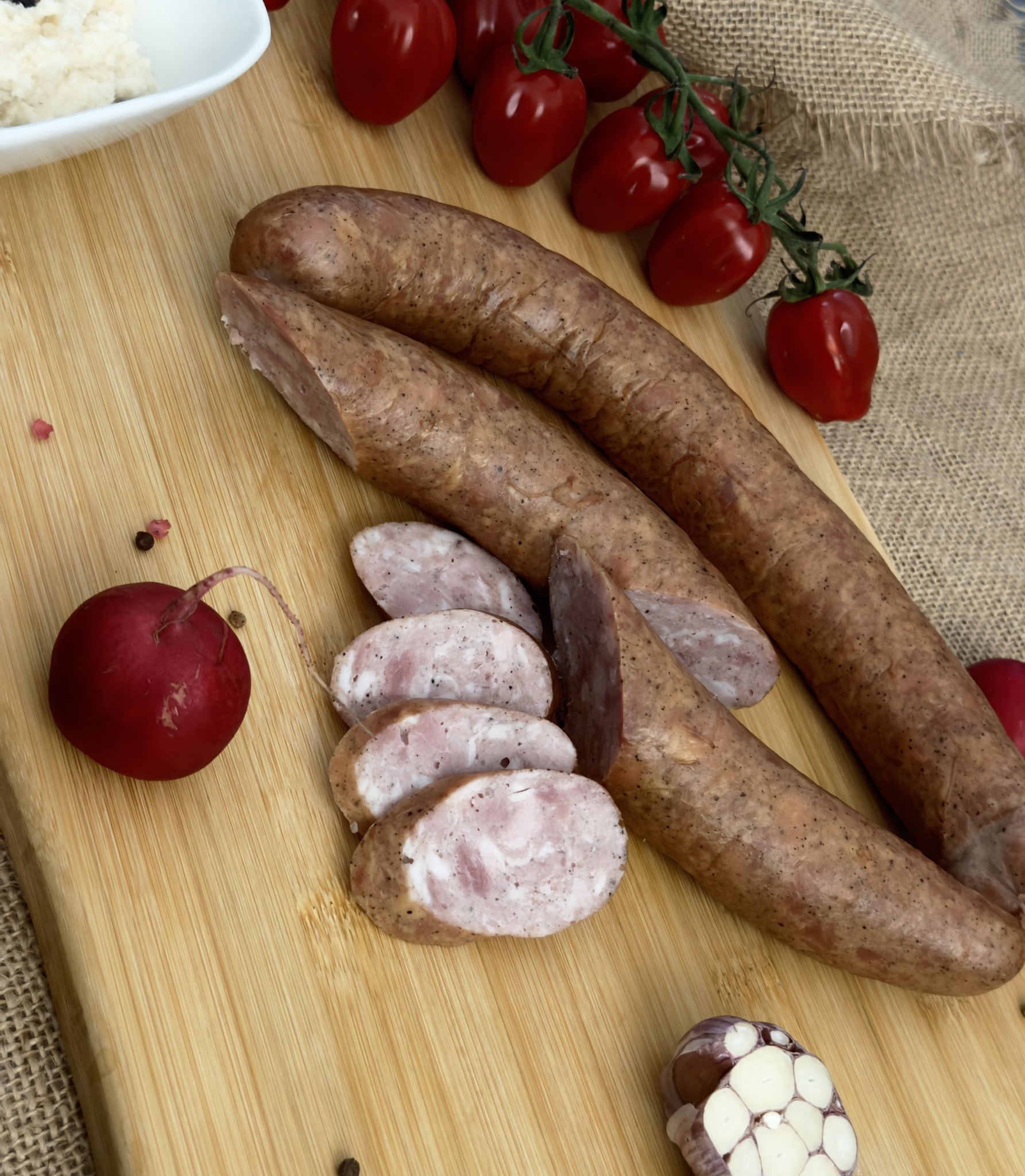 Kiełbasa wiejska z Kuznocina – Nasz flagowiec. Mocno wędzona, z wyraźną nutą czosnku i grubo mielonym pieprzem.